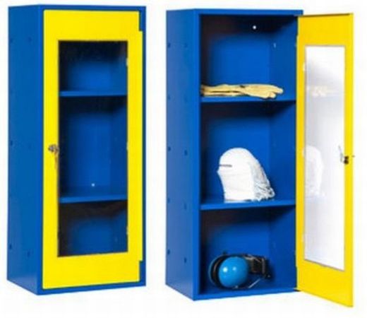 Armario para almacenar EPIs. Cerradura estándar cuadradillo hembra 8mm. Fabricado en acero laminado en frío espesor 0,7 mm. Bandejas regulables, dos por armario. Color estándar: Amarillo Azul RAL 5010 gofrado. Puerta amarilla RAL 1021 gofrado con visor de policarbonato. Medidas: Ancho 300 mm. / Alto 750 mm. / Profundidad 225 mm. Referencia 11024 Dimensiones (Frente x fondo x alto) 300 x 225 x 750