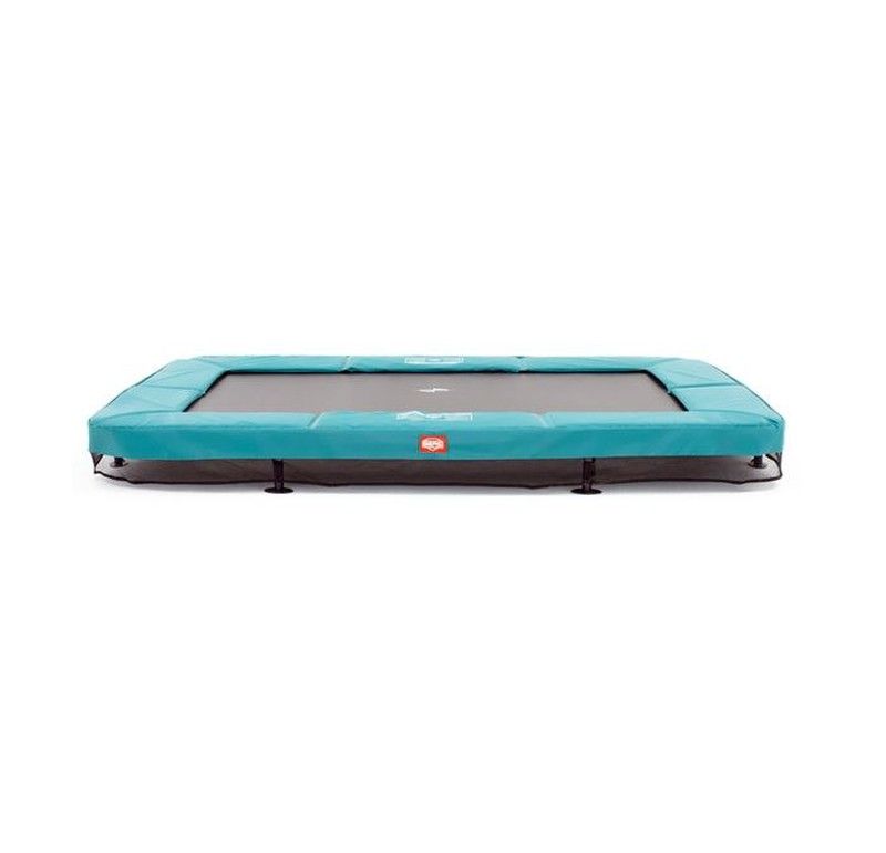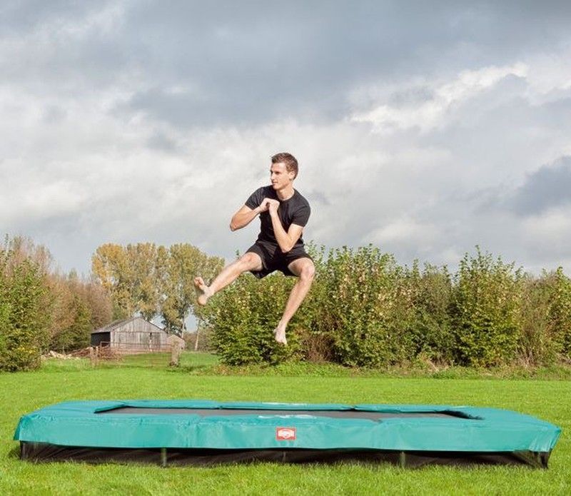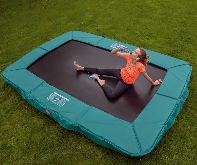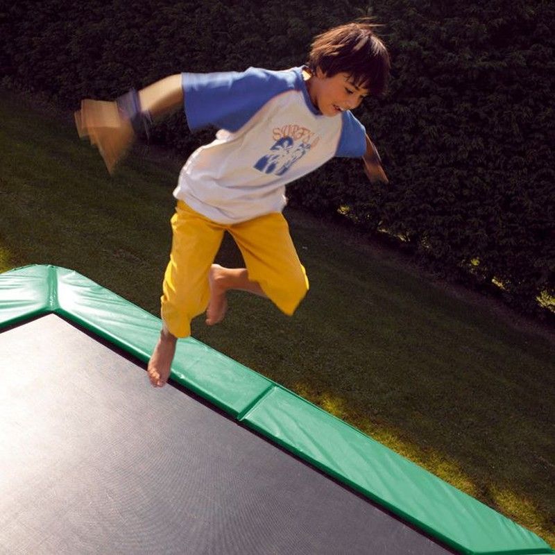 Cama elástica rectangular para ser enterrada. Para aquellos que quieren una cama elástica que no domine su jardín, la versión rectangular permite colocarla en un rincón. Gracias a su forma rectangular ocupa el espacio más eficientemente.