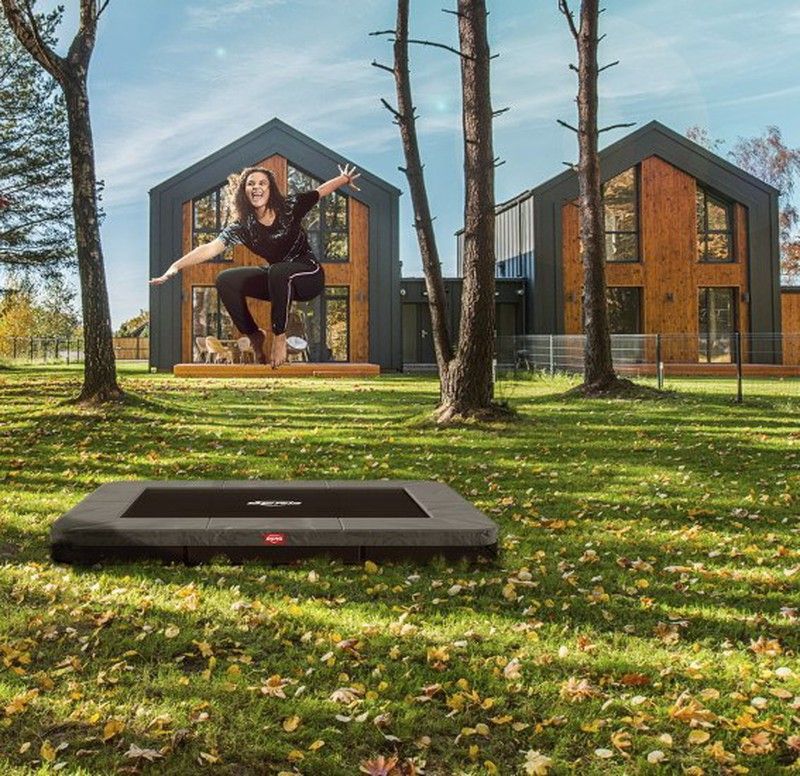 La forma del Ultim Favorit asegura que el trampolín se ajuste perfectamente en un diseño de jardín geométrico.
