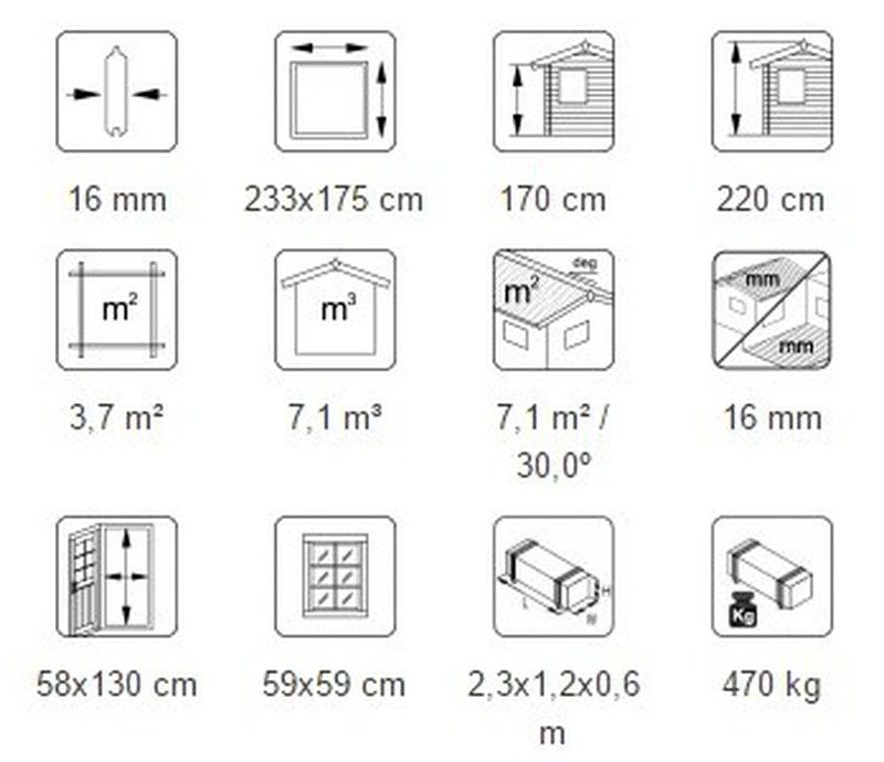 Es imprescindible que el lugar de entrega disponga de espacio suficiente para la entrada y descarga del camión . ESPECIFICACIONES DEL PRODUCTO:Garantía de 5 años, calidad superior y máxima seguridad Lamas de 16 mm de grosor de madera de abeto nórdico, resistente y segura.Las ventanas incluyen cristales de plexiglás con contraventanas para mayor seguridad de los niños.Medidas pared: 233 X 175 cmAltura de pared: 170 cmVolumen: 7.1 m3Tipo ventana/puerta: plexiglasVentana, medidas de paso: 59 X 59 cmPuerta, medidas de paso: 58 X 130 cmTablas del tejado: 16 mmSuperficie el tejado: 7.1 m2Inclinación del tejado: 30.0ºPeso: 470 kgPara la instalación es recomendable realizar una base de hormigón de 10 cm lisa y nivelada, para la perfecta colocación de su casitaUna vez montada la casita, aconsejamos tratarla con protector de madera y después aplicar una capa de barniz, esmalte de exterior, lasure o aceite de teca ( eficaz contra la intemperie y las inclemencias del tiempo)Todos los productos palmako cuyas medidas superen los 2.40 de largo, es necesario medios para la descarga, tipo pluma, carretilla elevadora, etc...de lo contrario le ofrecemos presupuesto de servicio de pluma para su descarga , dado que no se puede manualmente