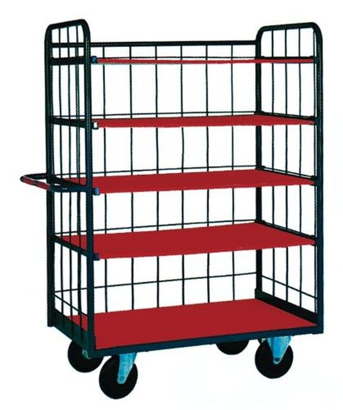 Estantería rodante CON BALDAS (60Kg/balda) de 5 alturas con perfil de acero. Laterales con malla reforzada, siendo de grán utilidad para el almacenamiento y transporte de mercancías en que se desea que sea visible su contenido y almismo tiempo estén protegidas del exterior. Tablero de fibra de madera de 19mm de espesor, con capacidad de 800 Kg. 2 Ruedas giratórias con freno y 2 figas. Distancia entre baldas de 275mm. También llamado: Estantería rodante con bandejas. Referencia 4021 Dimensiones (mm) largo x ancho x alto 1.240x700x1.790 Ruedas Fijas Ø 200 Ruedas Giratorias Ø 200 con freno Bandaje Goma Peso Kg 103 Carga Kg 800 (60Kg/balda)