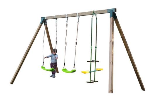 Este modelo incorpora 2 asientos planos para que se puedan columpiar 2 niños a la vez y 1 asiento “cara a cara” con el que se pueden columpiar 2 niños a la vez.