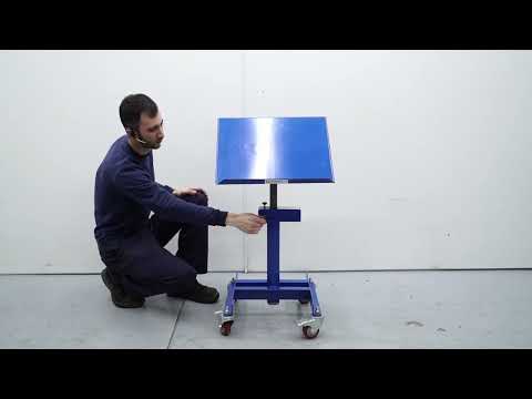 Descripción Posicionador de material, perfecto para poner el material de montaje, acabado final, cajas de producto semielaborado, documentación de montajes, planos, etc. Posee 4 ruedas giratorias de goma, perfectas para no dañar el suelo. La elevación de la mesa va desde 720 mm hasta 1.070 mm y puede inclinarse desde 0º hasta 40º. En uno de los laterales de la mesa posee un canto para el apoyo de cajas o artículos impidiendo de esta manera que se caigan a suelo cuando la mesa esté inclinada. Fabricación a medida, consúltenos. También llamado: Carro con soporte reclinable.
